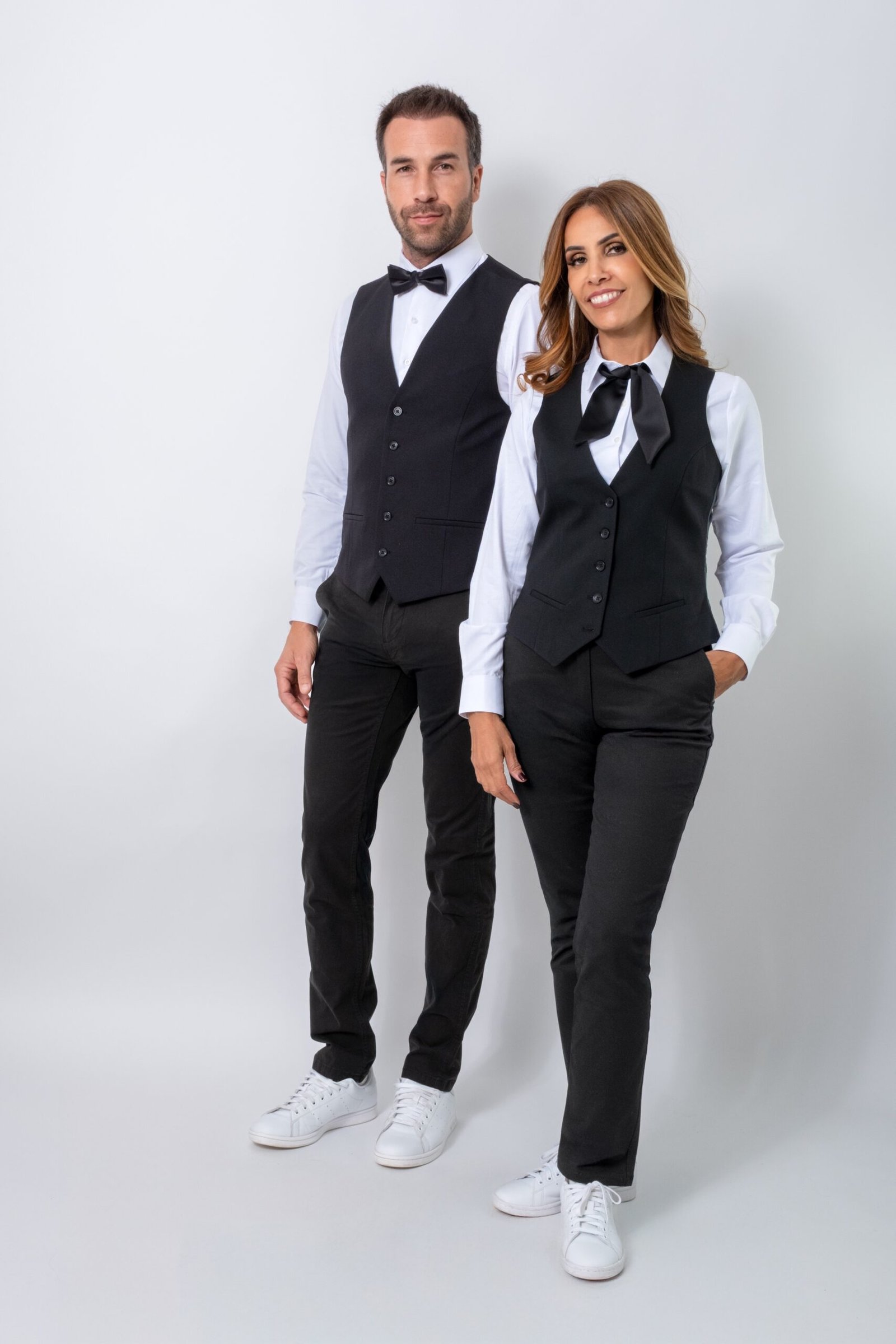 Le look casual chic se fait une place dans le vestiaire des équipes de service, associant pantalons chino ou jeans, confortables et tendance, à des chemises aux coupes ajustées unies ou imprimées, gilets ouverts ou boutonnés, le tout agrémenté de tablier en denim ou en cuir, de bretelles, de nœuds papillon en matière texturée et colorée.